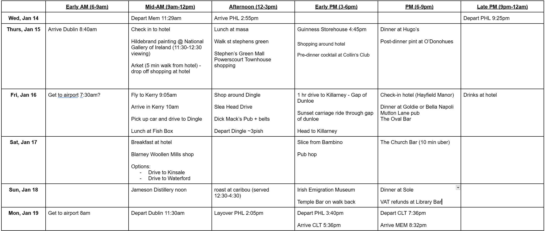 I shared above a breakdown of where we were each day, but I’ll share the full itinerary below. We had plans to drive from Dingle to Killarney and visit the Gap of Dunloe and ride horses at sunset through the Gap; however, we accidentally wrecked into a ditch and had an unplanned excursion to a dairy farm waiting for our car to be pulled out. So according to the itinerary, we went to Gap of Dunloe, then Cork - but instead we played with cows and learned about dairy farming (shoutout Kerrygold), and then went to Cork.