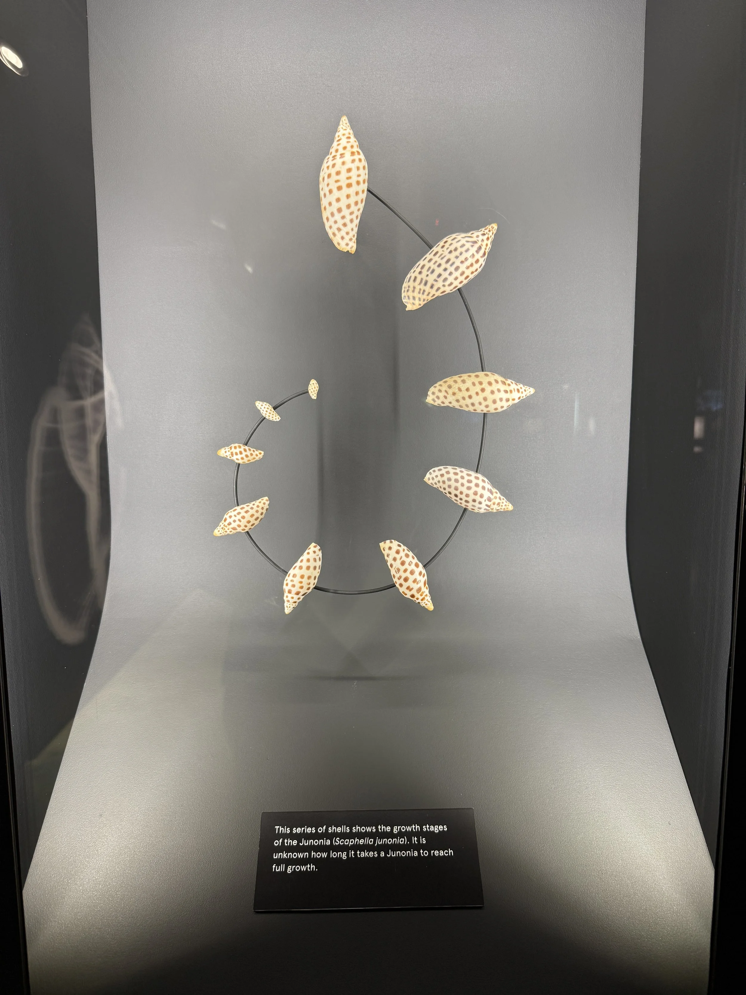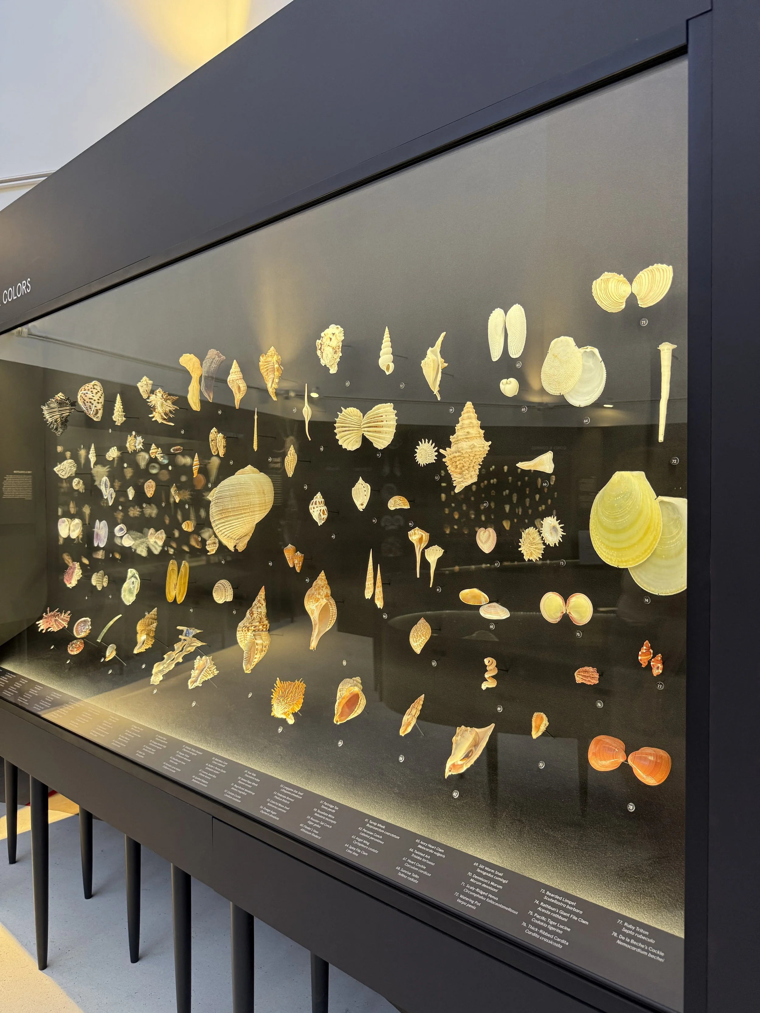 A beautiful, high-ceilinged circular room with the entire wall covered in shells. In the middle of the room, more shells - but interestingly they’re shown as counterparts to each other showing the Pacific Ocean version and the Atlantic Ocean versions of the same shells.