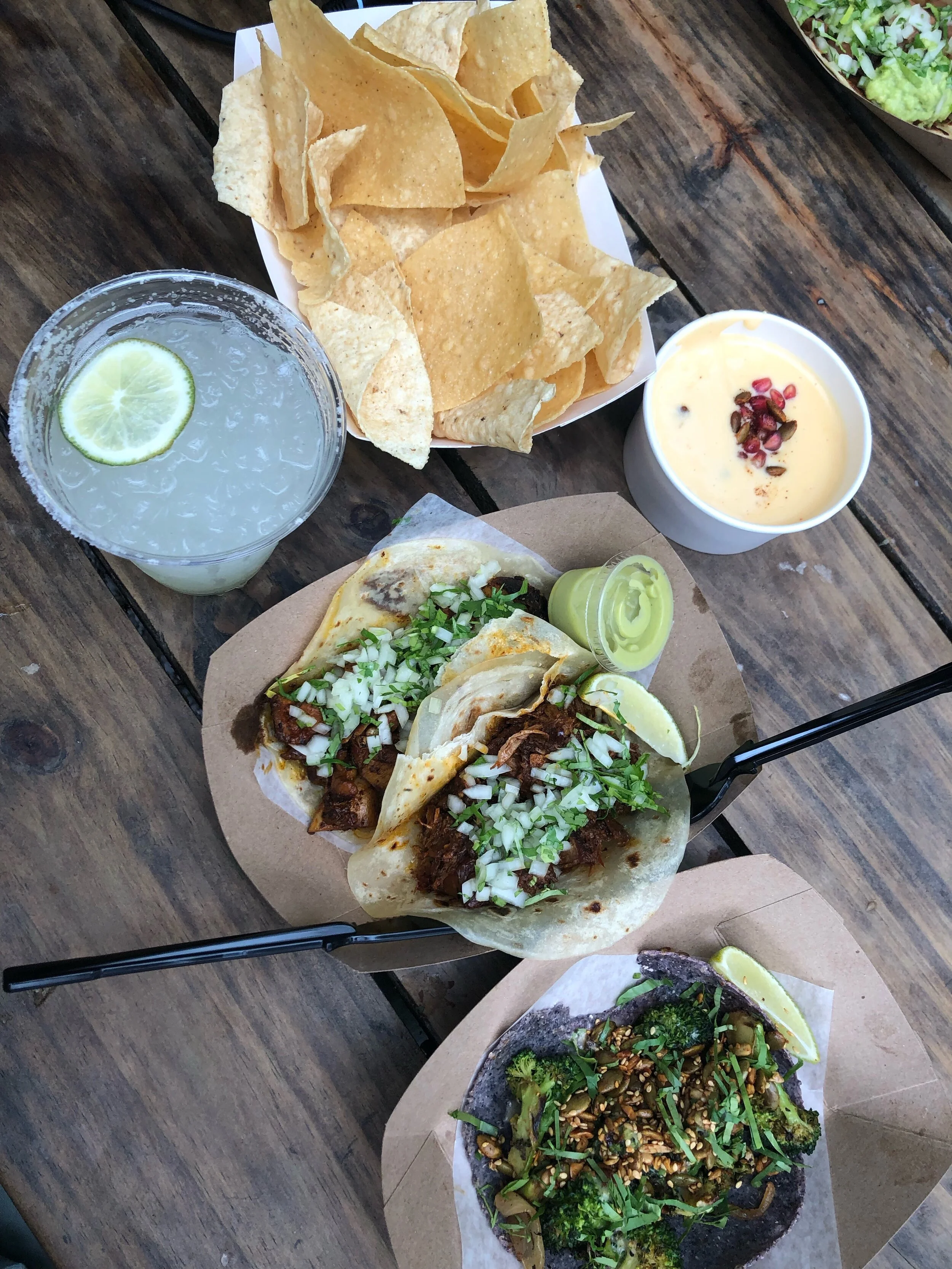 A tiny backyard setup with some of the best tacos and fresh margaritas. I got 3 tacos: vegetarian broccoli, chicken, and pork. I also got the quesadilla and it was so salty and cheesy… we love it. The margarita was so fresh, too.